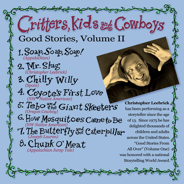 “Good Stories From All Over”, Volume I, is Chris’ first CD and remains one of his most popular. Honored with a Storytelling World Award, this CD is an enchanting multicultural collection and includes folk tales from the hills of Appalachia, a Native American legend, a wonderful adventure story from Africa, a cowboy story from the Oregon high desert, narrative poetry, as well as a little known story from the Brothers Grimm. Check it out!
